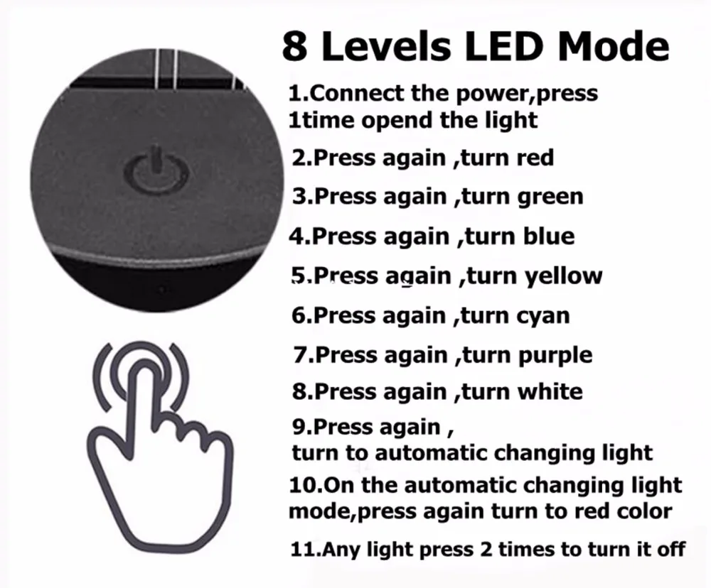 Основной метод: Используйте салфетки для чистой комнаты протрите акрил не прикасайтесь к поверхности акриловой пластины пальцами, чтобы избежать отпечатков пальцев на пластине, которые могут повлиять на 3D иллюзию напоминание: перед использованием снимите защитную пленку, светильник будет более прозрачным. Пожалуйста, внимательно прочитайте menual перед использованием. И товары не включают батареи.