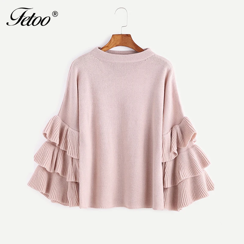ФетуThrEeМногослойный свитер с рюшами на рукавах, милые пуловеры 2017, Осенний Модный женский свободный Короткий Джемпер, однотонный элегантный осенний свитер