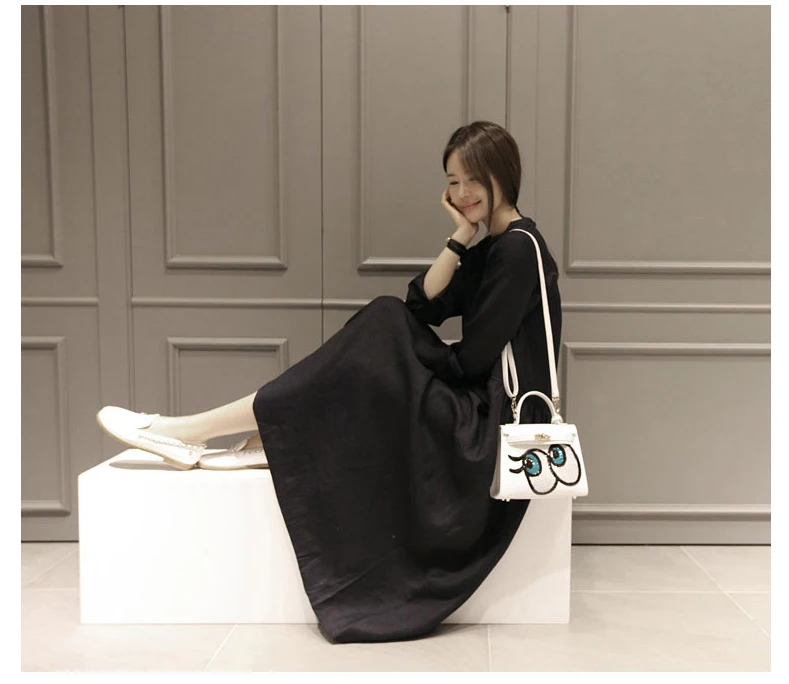Женское новое осеннее платье, хлопковое льняное винтажное платье с длинным рукавом, повседневное Свободное платье с v-образным вырезом, черное белое пляжное платье