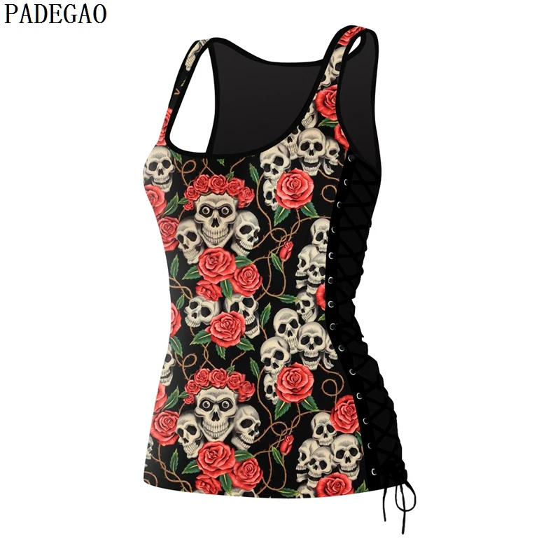 Padegao цветочный принт череп танки u воротник шнуровка панк-топы женщин Хэллоуин готика топы и тройники