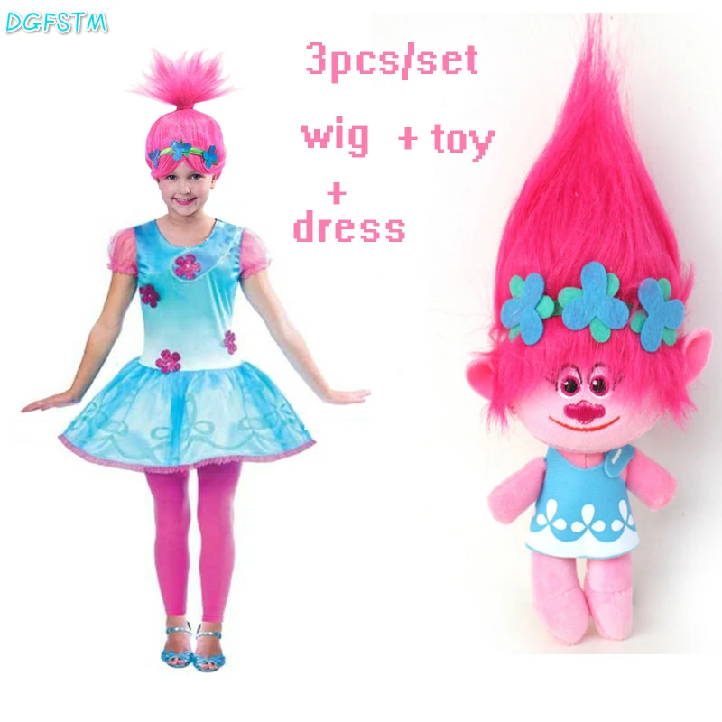 Retail Troll Wig +dresses+toy set Children Costumes For Girls Carnival Kids Costumes Summer Girl Dress Trolls Clothes Poppy Party