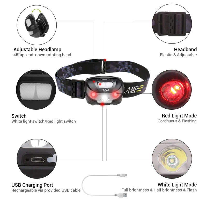 • Лампы CREE мощностью 5 Вт с 3 режимами белого света и 2 режимами красного света