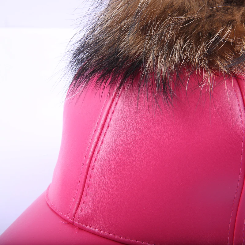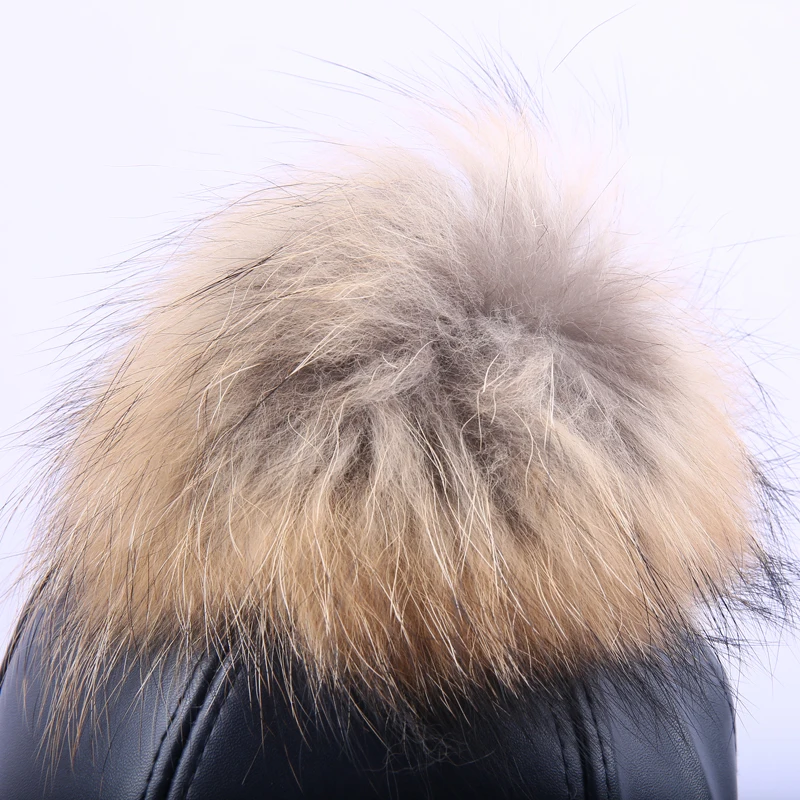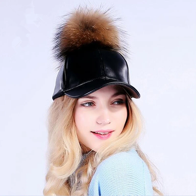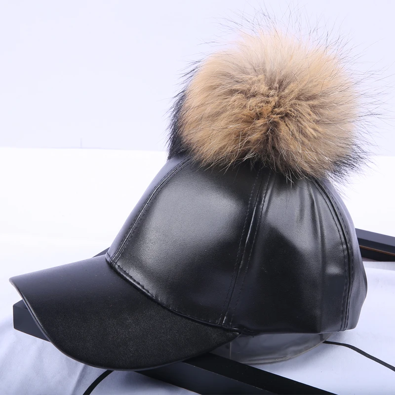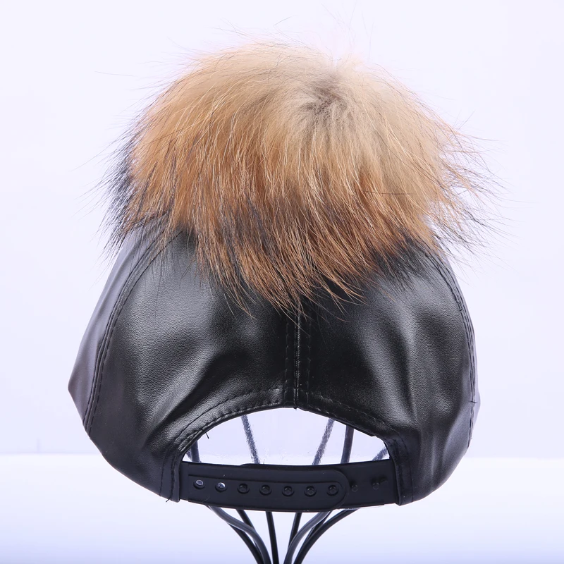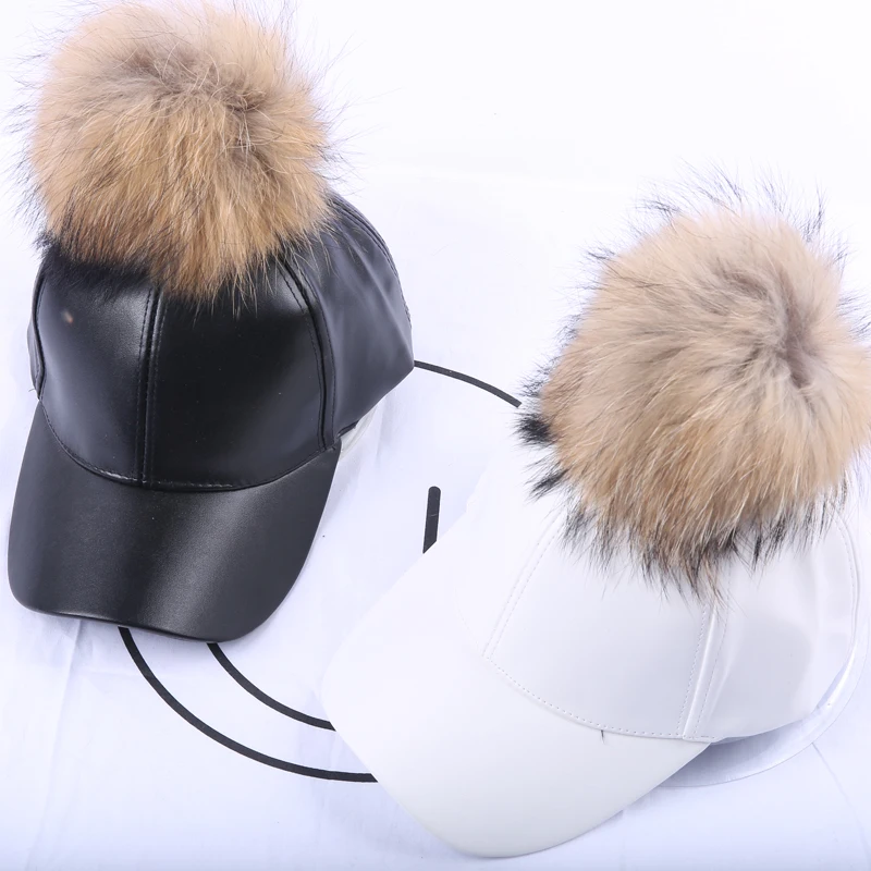 14 Colors Fashion Real Raccoon Fur Pompoms Hats Hip Hop candy color PU Leather Baseball Cap women Fur Pom Pom Snapback Hat Caps
