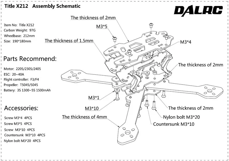 Dalrc title x212 212 мм карбоновый каркас комплект 4 мм Arm 4 шт. 5045 3 лезвия пропеллеров поддержки 2205 2206 2305 2306 2600кв мотор