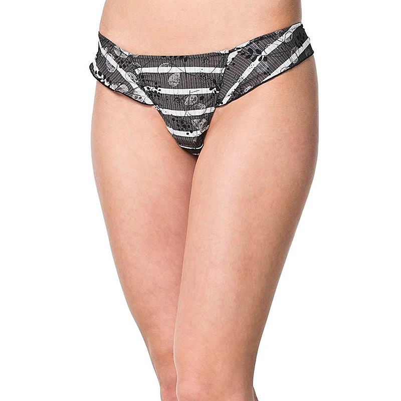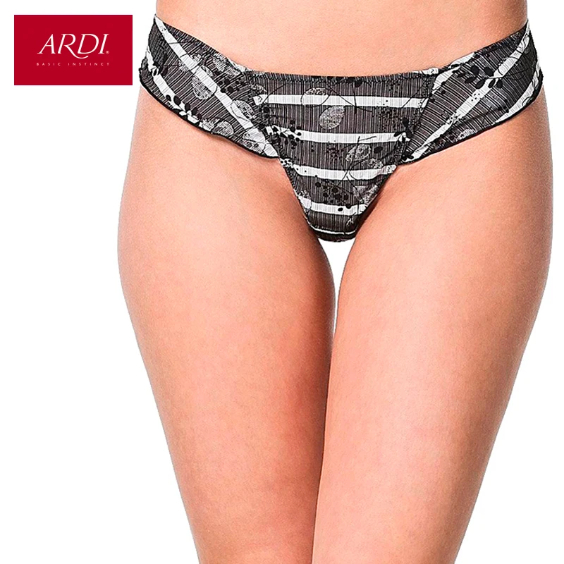 Стринги изготовлены из тонкой жаккардовая ткань с рисунком. Передняя часть двух симметричных вертикальных рельефов. Нижний край боковых частей обработан на микровилларе. Сзади треугольный вырез. Нижний край задней детали обработаны на микровилларе формой Рюш. Ластовица выполнена из хлопка.