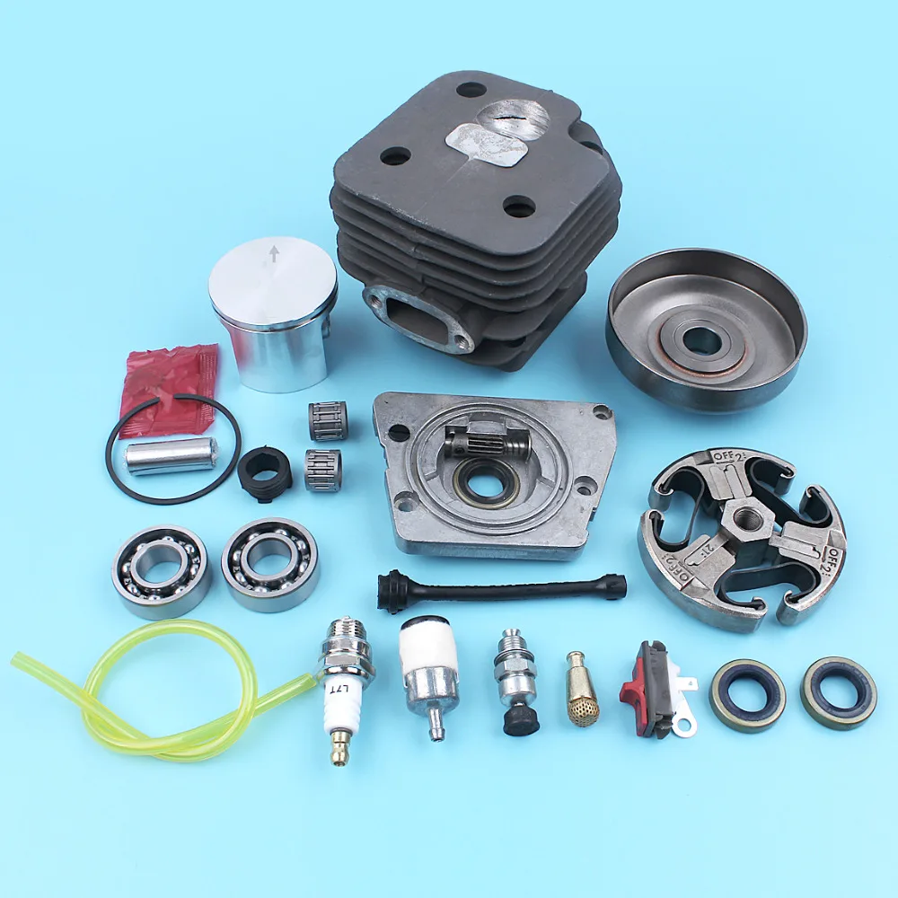 Цилиндр 1x52 мм, 1 поршень, 1 штифт, 1 кольцо, 2 зажима, 1 сцепление, 1 барабан сцепления, 1 клапан декомпрессии, 2 игольчатый подшипник, 2 шариковых подшипника, 2x сальник, 1x выключатель, 1x Топливный фильтр, 1x топливная линия, 1x масляный фильтр, 1x масляная линия, 1x масляный насос, 1x червячная передача, 1x Свеча зажигания
