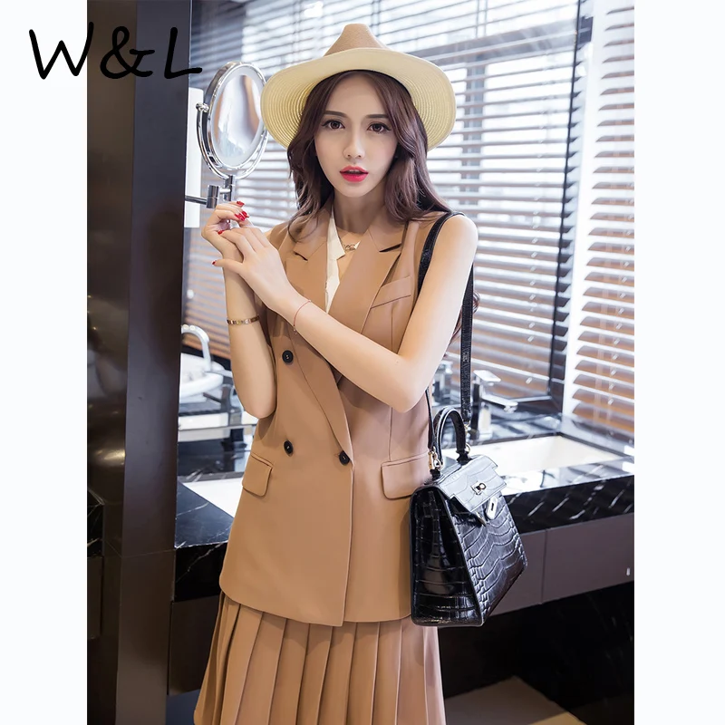 Плиссированные Костюмы юбочные 2017 Для женщин Элегантный Бизнес Костюмы Прохладный Тонкий Блейзер формальный офис леди Двойка длинные жилетка верхняя одежда