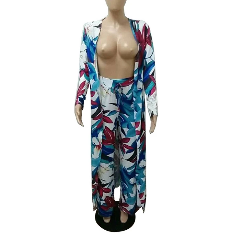 2017г. осень длинный рукав плащ цветочный принт кардиган брюки костюм Два шт. комплект Женский Повседневный Свободный комбинезон комплекты одежды
