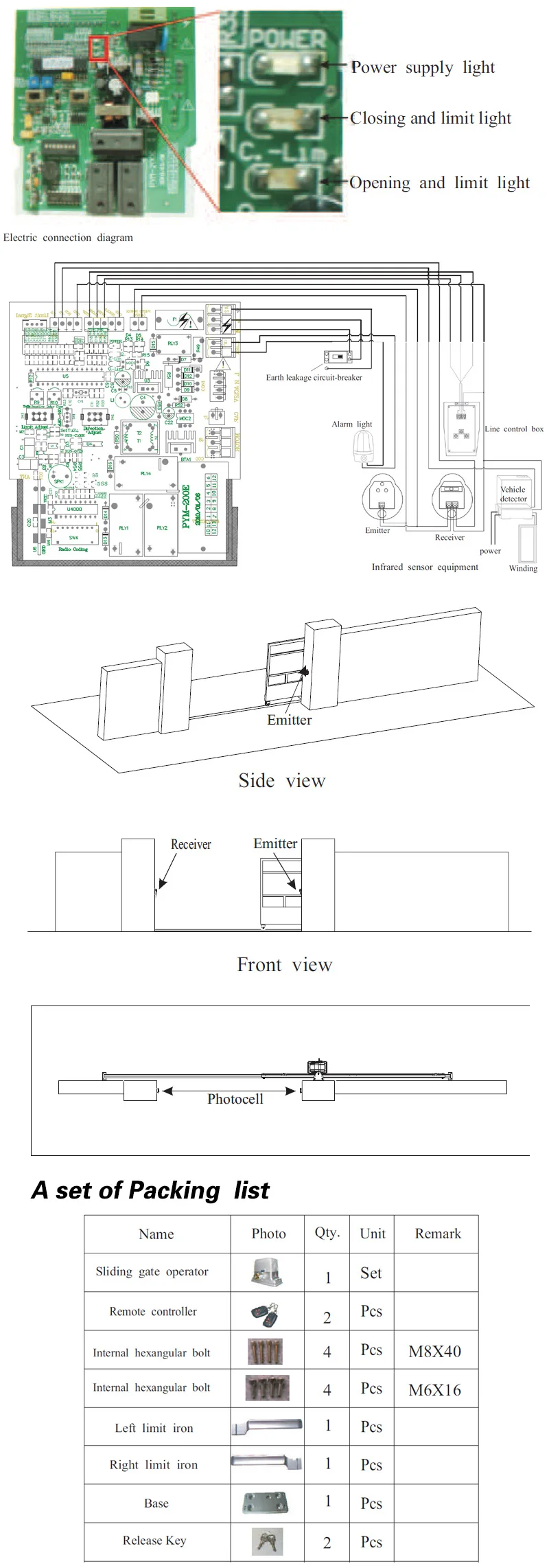 Это оборудование является одним из открывателей автомобильных ворот, запущенных нашей компанией, которая принимает новый дизайн и интегрированную систему управления. Наши новые раздвижные ворота открывалка имеет много функций, таких как: низкий уровень шума, легкий вес, мощный пусковой момент, стабильность, надежность и Компактный и стильный. Двигатель будет работать в течение короткого периода времени с использованием низкого напряжения. Плата управления имеет защиту от перегрузки. Когда происходит сбой питания isa, привод двигателя может быть разделен с помощью сцепления, с помощью специального ключа пользователь имеет возможность отсоединить сцепление, что позволяет ворота открываются или закрываются вручную. При помощи дополнительных инфракрасных фотоэлементов ворота автоматически останавливаются и повторно открываются, если обнаруживается препятствие.