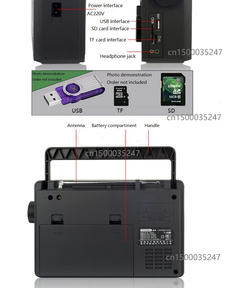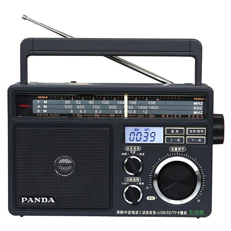 Brand: PANDACategory numbers show radioModel T-09Colour: BlackFunction parameterFM frequency range 88-108MHZAM frequency range 530-160KHZPower supplyOutside function supportExternal sound supportU disk play supportPlayback format MP3 / WMADisplay mode LCDOutside jack USBSDTFHeadphone jack is normalUSB jack is normalSpecificationsCharging voltageAC: 220vDC: 4.5vOutput power 1.3WMaximum power consumption 3WGross weight (KG) 1.25Net weight (KG) 0.868Product dimensions mm 212 * 137 * 64Packing size mm 245 * 170 * 110packing list:Host × 1; power cord × 1 ;warranty card × 1; manual × 1;