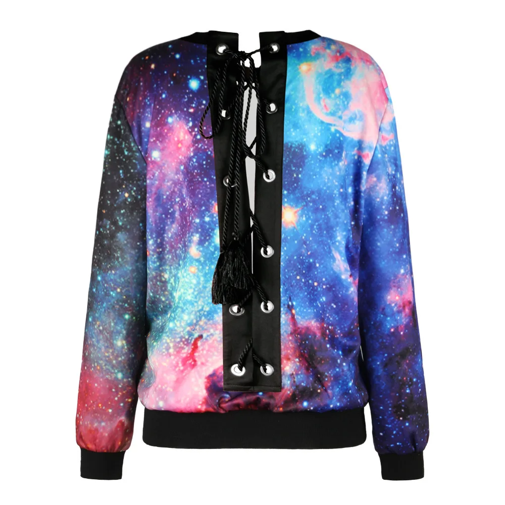 Галакси принт мода с длинным рукавом с круглым вырезом толстовки в стиле casual стиль пуловеры горячая Распродажа женские осенние сексуальные сзади на шнуровке спортивные костюмы фантастические
