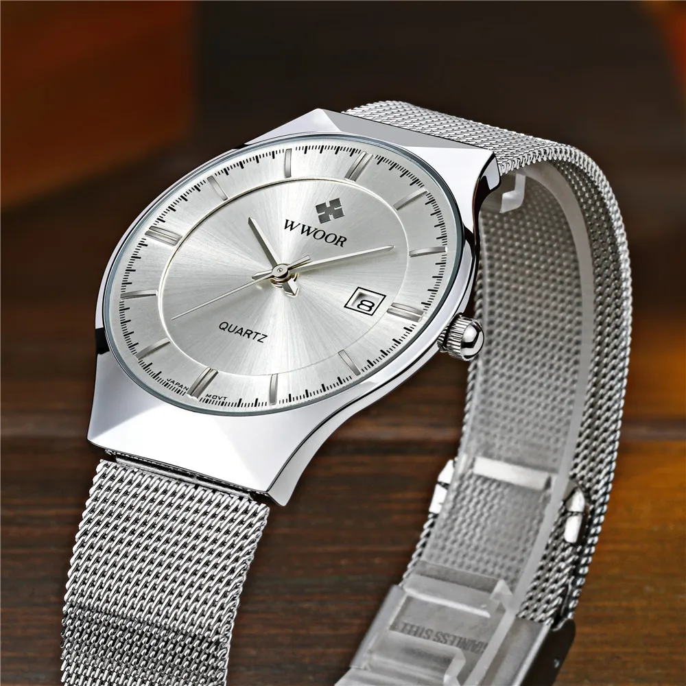 Бренд: WWOOR Стиль: Модный, Повседневный, деловой, роскошный, спортивный Дисплей: Аналоговый Механизм: оригинальный японский кварцевый механизм Seiko VJ32 Аккумулятор: MAXELL/SONY 626 Основная особенность: -100% новый с биркой и высоким качеством; -Простой Ультратонкий дизайн, функция отображения даты; -5 атм/50 м Водонепроницаемость (поддержка холодного душа и плавания, не использовать часы под водой, не поддерживать горячую воду); -Качественный корпус из цинкового сплава; -Качественная сетка из нержавеющей стали; Спецификация (приблизительная): -Диаметр корпуса: 38 см -Толщина корпуса: 0,9 см -Ширина ремешка: 2,0 см -Общая длина: 23,0 см -Вес изделия: 58 г В комплект входит: -Часы WWOOR-1 шт. -1 гарантийный талон -1 x Подарочная коробка WWOOR