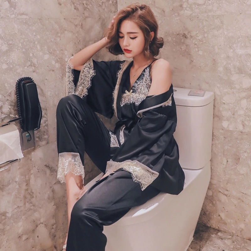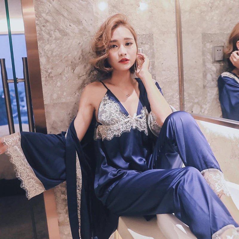 Брендовые женские кружевные атласные пижамы набор + халат три штуки искусственный шелк Женское ночное белье сексуальное Homewear летние Ночные рубашки Новые