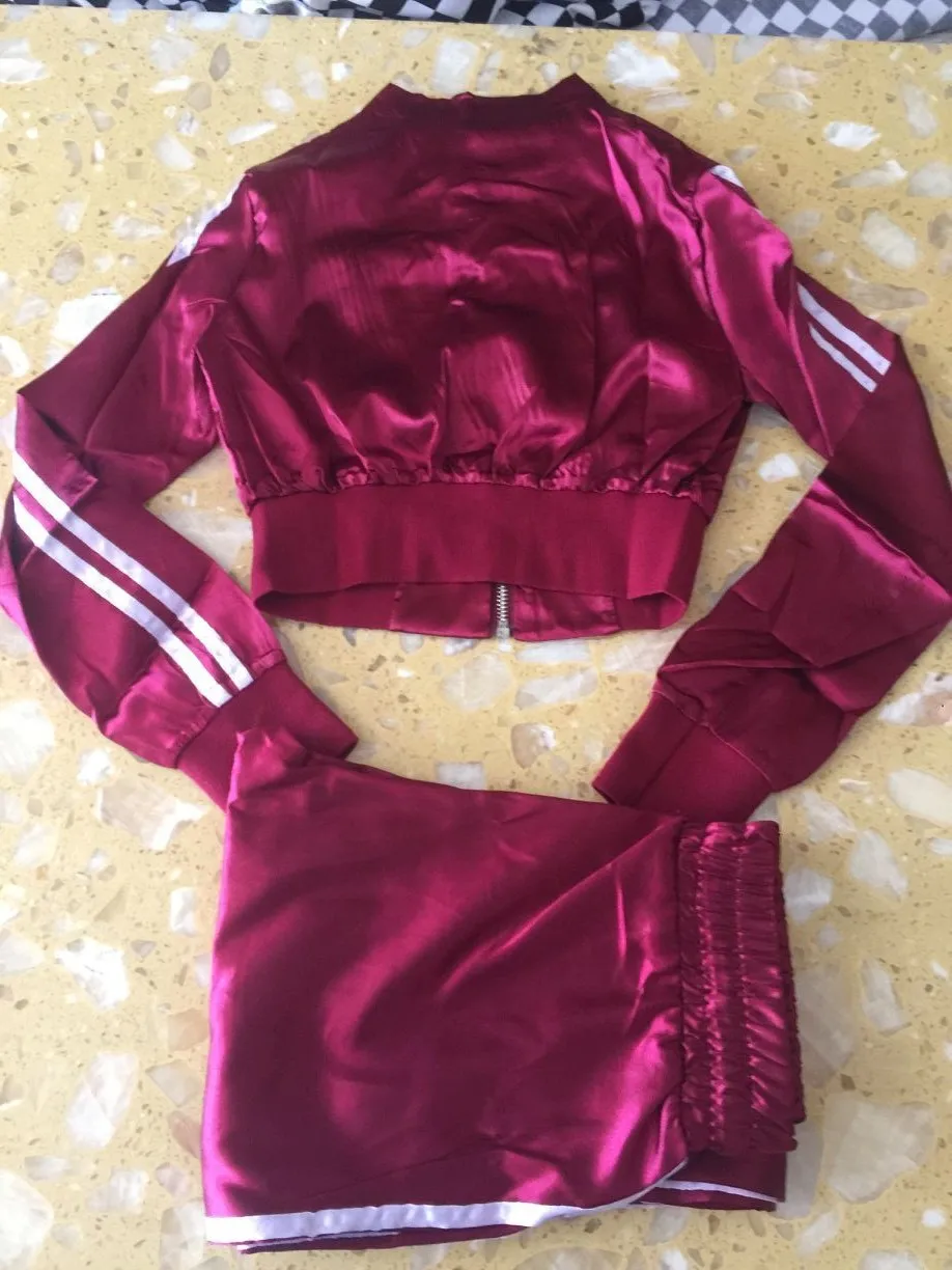 Атласный комплект из двух предметов, спортивный костюм для женщин, повседневный комплект из 2 предметов, укороченный свитер, штаны, костюм, куртка на молнии, полосатый Женский комплект одежды