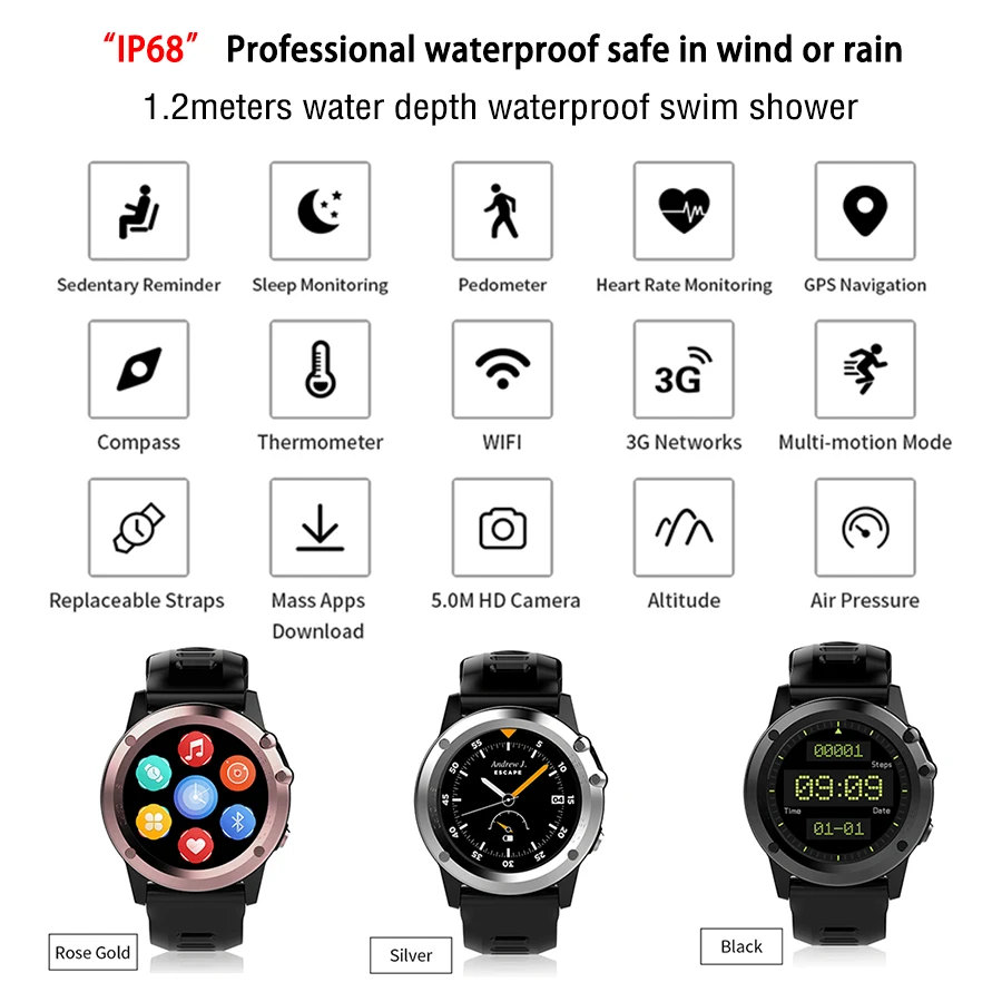 | Основной Функция | GPS-навигация, 3G сеть, высота, давление воздуха, wifi, шагомер, 30 м Дайвинг водонепроницаемый, пульсометр, монитор сна, задвижное напоминание, |