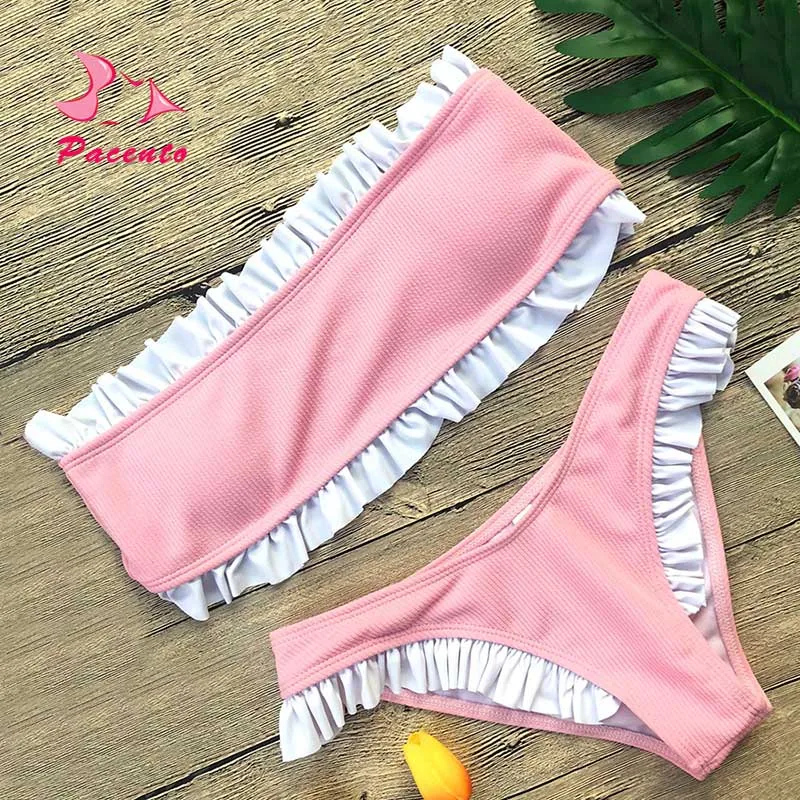 Pacento однотонный Бикини бандо Бикини 2018 купальник с рюшем Женский черный розовый купальник женский сексуальный купальник