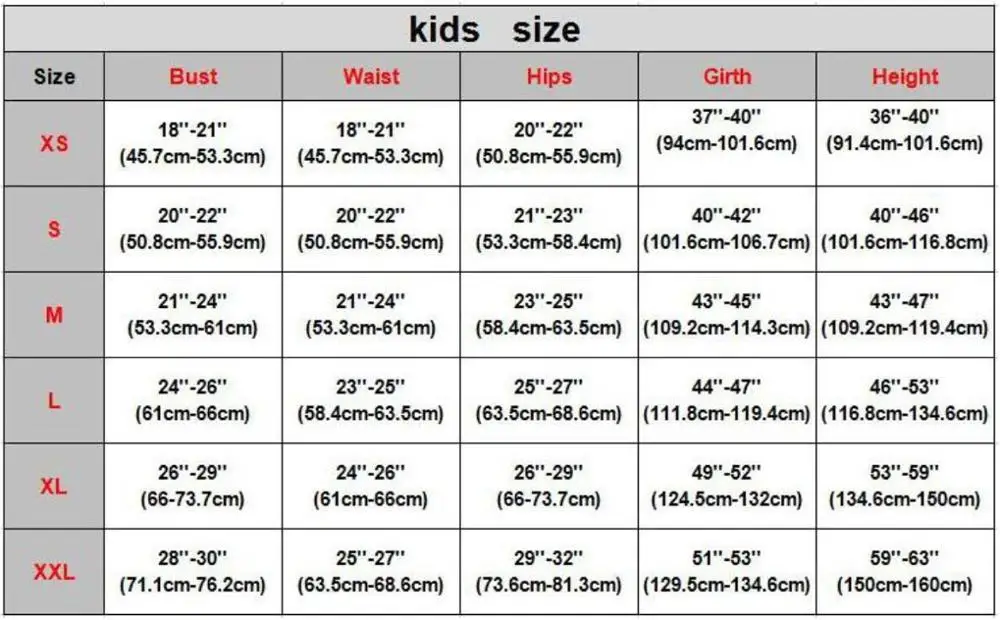 XS/(2-4): Высота: 36 ''-40'' (91,4 см-101,6 см), обхват груди: 18 ''-21'' (45,7 см-53,3 см), обхват талии: 18 ''-21'' (45,7 см-53,3 см),Бедра: 20 ''-22'' (50,8 см-55,9 см), обхват: 37 ''-40''(94 см-101,6 см) S/(4-6): Высота: 40 ''-46'' (101,6 см-116,8 см), обхват груди: 20 ''-22'' (50,8 см-55,9 см), обхват талии: 20 ''-22'' (50,8 см-55,9 см),Обхват бедер: 21 ''-23'' (53,3 см-58,4 см) обхват: 40 ''-42'' (101,6 см-106,7 см) M/(6X-7): Высота: 43 ''-47'' (109,2 см-119,4 см), обхват груди: 21 ''-24'' (53,3 см-61 см), обхват талии: 21 ''-24'' (53,3 см-61 см),Бедра: 23 ''-25'' (58,4 см-63,5 см), обхват: 43 ''-45'' (109,2 см-114,3 см) L/(7-10): Высота: 46 ''-53'' (116,8 см-134,6 см), обхват груди: 24 ''-26''(61 см-66 см), обхват талии: 23 ''-25'' (58,4 см-63,5 см),Бедра: 25 ''-27'' (63,5 см-68,6 см), обхват: 44 ''-47'' (111,8 см-119,4 см) XL/(10-12): Высота: 53 ''-59'' (134,6 см-150 см), обхват груди: 26 ''-29''(66 см-73,7 см), обхват талии: 24 ''-26''(61 см-66 см),Бедра: 26 ''-29''(66 см-73,7 см), обхват: 49 ''-52'' (124,5 см-132 см) XXL/(12-14): Рост: 59 ''-63''(150 см-160 см), обхват груди: 28 ''-30'' (71,1 см-76,2 см), обхват талии: 25 ''-27'' (63,5 см-68,6 см),Бедра: 29 ''-32'' (73,6 см-81,3 см), обхват: 51 ''-53'' (129,5 см-134,6 см)
