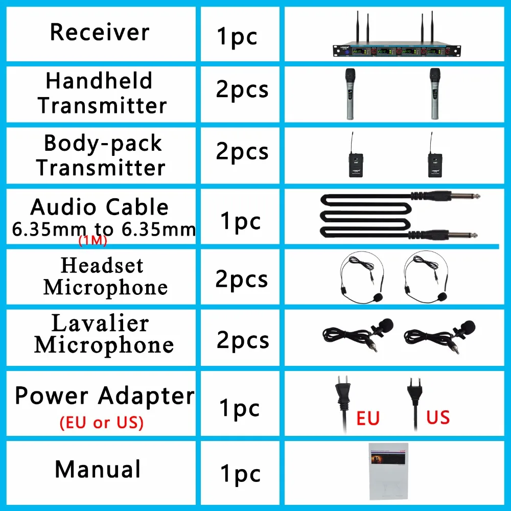 1) Приемник: 1 шт.2) портативный микрофон: 2 шт.3) микрофон гарнитуры: 2 шт.4) зажим для микрофона: 2 шт.5) боди: 2 шт.6) аудио кабель: 1 шт.7) Адаптер питания: 1 шт.8) Руководство пользователя: 1 шт.Обратите внимание: