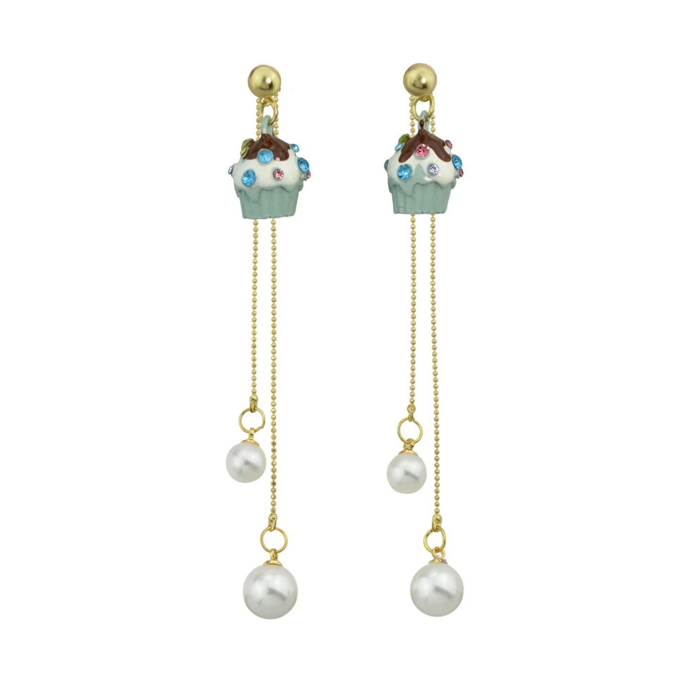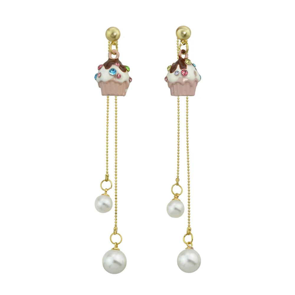 Милые золотые-цвета длинной цепи с имитацией-жемчужный цвет в виде Эмали Чашки Торт Висячие серьги для женщин модные украшения