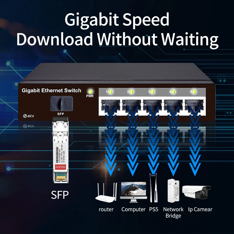 Все порты:5 * Стандартный 10/100/1000 Мбит/с Ethernet порт. 1 * SFP порт