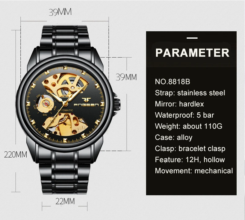 Механизм: механический Диаметр циферблата: 39 мм толщина циферблата: 15 мм Длина ремешка: 220 мм ширина ремешка: 22 мм Вес: 110 г Водонепроницаемость: 5 бар стекло: устойчивое к царапинам минеральное стекло Тип застежки: браслет застежка пожалуйста, позвольте 1-2 см разница из-за ручного измерения. Мы благодарим Вас за понимание!