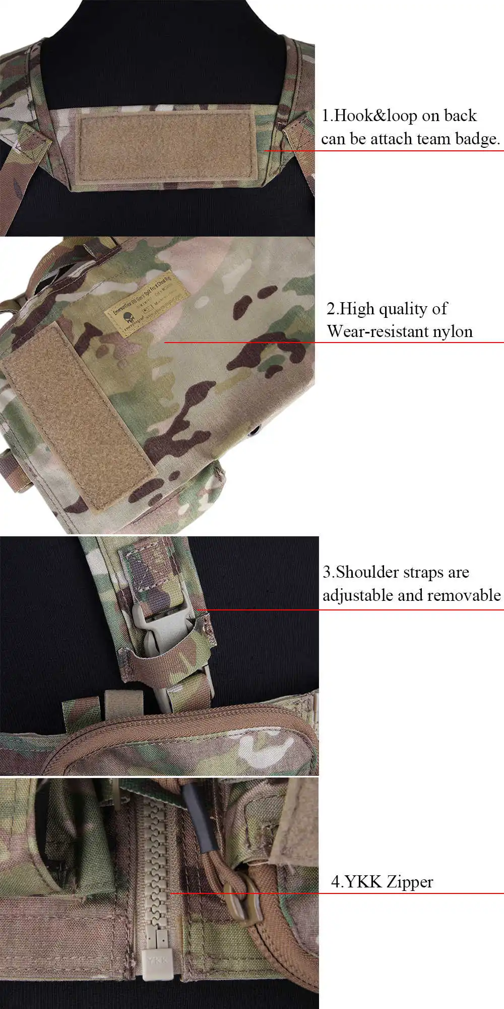 1) крючок и петля на спине можно прикрепить Значок команды. 2) Высокое качество износостойкого нейлона 3) лямки регулируемые и съемные 4) застёжка-молния YKK | |