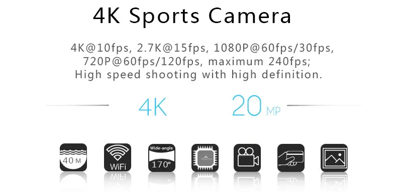 Разрешение видео: 4 К (3840x2160) 10fps, 2.7 К (2704x1524) 15fps, 1080 P 60fps/30fps, 720 P 120fps/60fps, VGA (672x380) 240fps