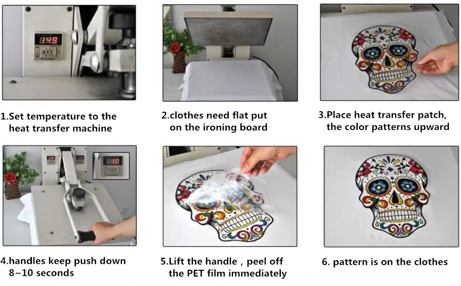 1: одежда и так далее должны быть сглажены, Выберите место передачи тепла, лучше всего не использовать паровой утюг, установка гладильной машины для хлопка состояние изделия (состояние глажки зависит от качества продукта), температура uder 120 ~ 150 градусов, сила нажмите вниз держать 10 секунд. Надавливайте давление достаточно, большая площадь теплопередачи картины назад и вперед небольшой диапазон глажки, используйте силу равномерно, попробуйте сделать бесшовное нажатие глажки