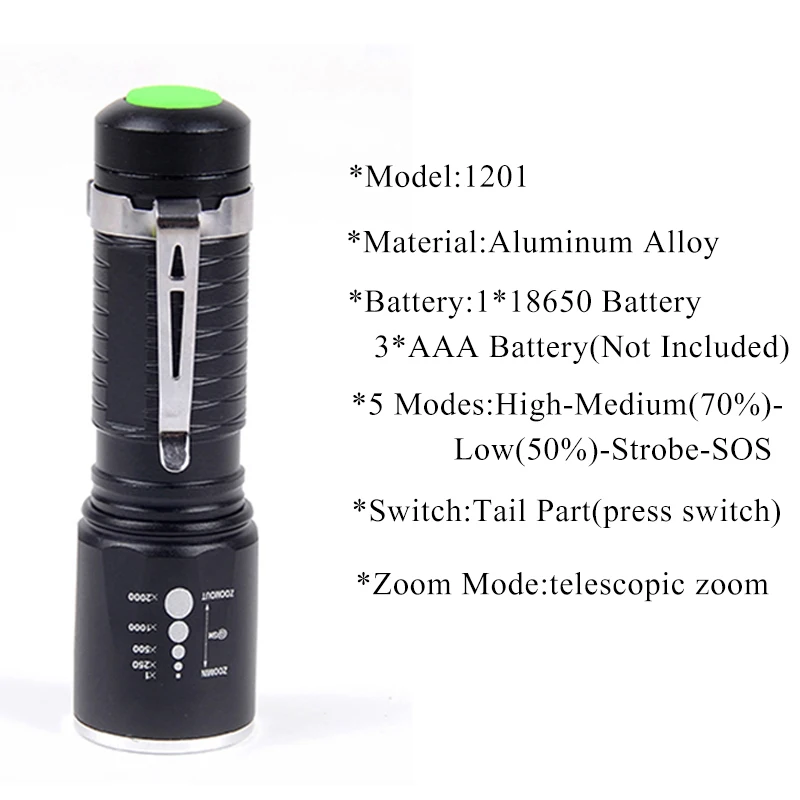 Особенности: Ламповые бусины принять высокого качества T6 Led, длительный срок службы более 100000 часов. Высокая яркость, энергосбережение, экологически чистый, высокопрочный воздушный алюминиевый сплав. Пять режимов затемнения могут удовлетворить различные потребности пользователей в освещении в разных средах Подходит для охоты, велоспорта, альпинизма, кемпинга и активного отдыха и т. д. Мини-фонарь сЗажим для удобной переноски. Противоскользящий дизайн, устойчивый к падениям, устойчивый к сжатия, износостойкий и водонепроницаемый. Технические характеристики: Бренд: pocktman Модель: 1201 Бусины лампы: CREE XML-T6 5 режимов: высокий (100%)-Средний (70%) -низкий (50%) -стробоскоп-SOS Режим масштабирования: телескопический зум Батарея: 1*18650 батарея/3 * AAA батарея (не входит в комплект) Расположение переключателя: хвостовая часть (нажмите переключатель) Размеры: 11 см (длина) * 3 см (диаметр головки) * 2,6 см (диаметр хвоста) Материал: алюминиевый сплав Посылка включает в себя: Вариант A:1 x T6 светодиодный фонарик Фонарь (Розничная посылка не входит в комплект) Вариант B:1 x T6 светодиодный фонарик Фонарь + 18650 батарея