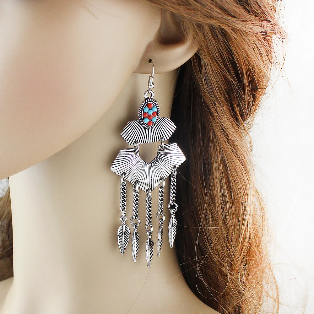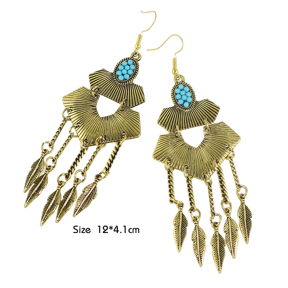Vintage Jewelry Antique Gold Silver Color With Blue Red Beads Feather Shape Chandelier Drop Earrings For Women