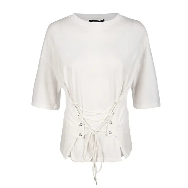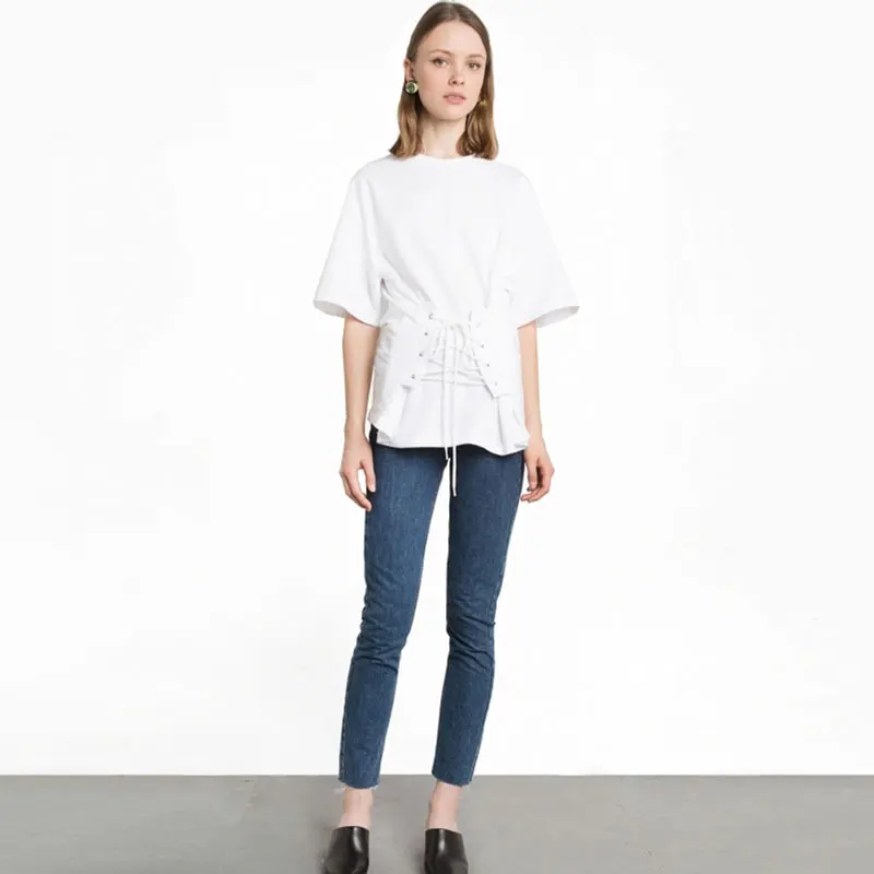 | KMD komoda цельная белая Передняя кружевная женская футболка Preppy короткий с O-образным вырезом топы Повседневная Свободные женские летние топы футболки |