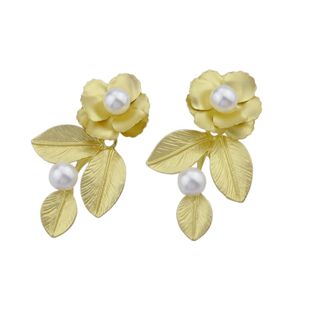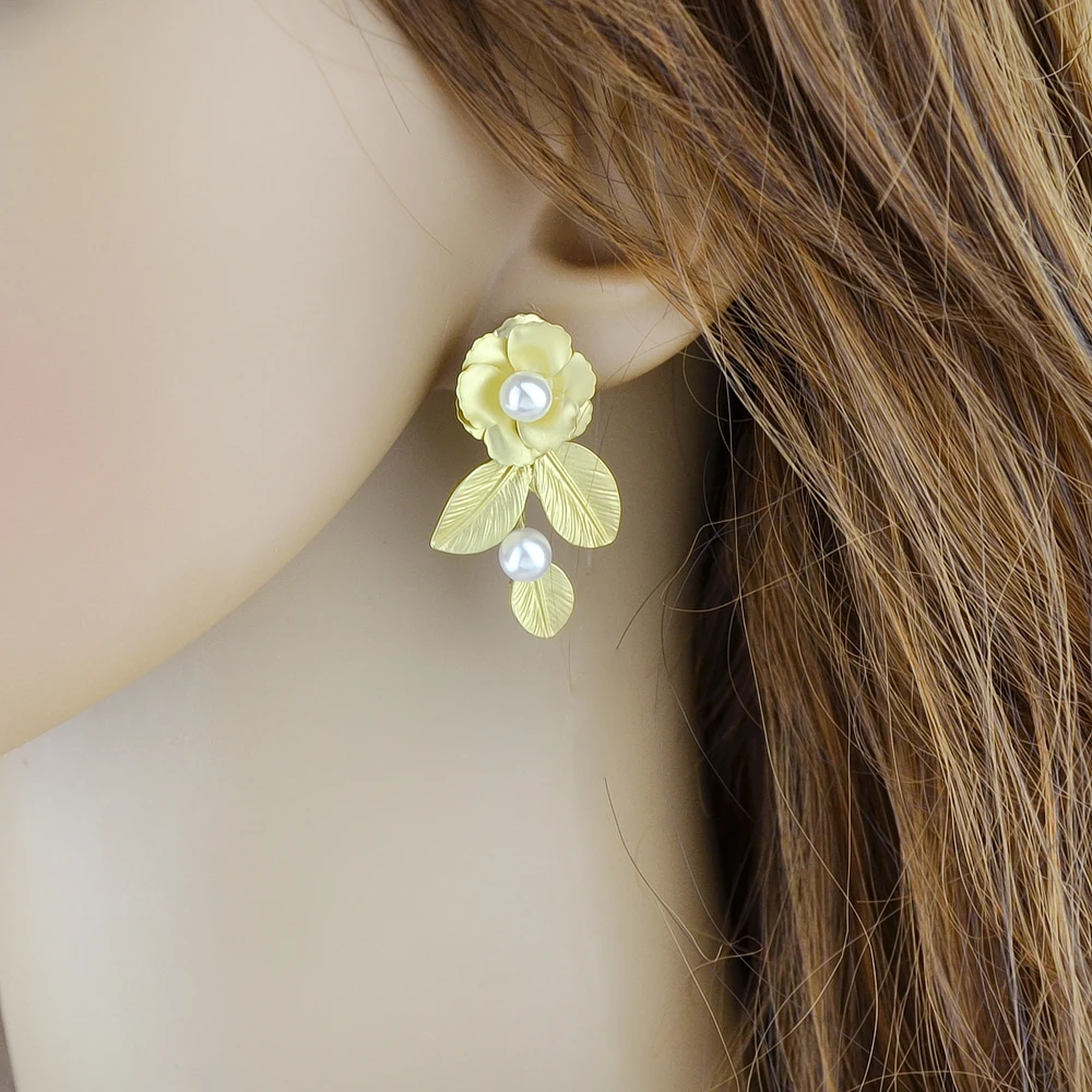 Роскошные Брендовые женские украшения золотого цвета с имитацией-жемчужный Лист Розы цветок формы серьги-гвоздики аксессуары