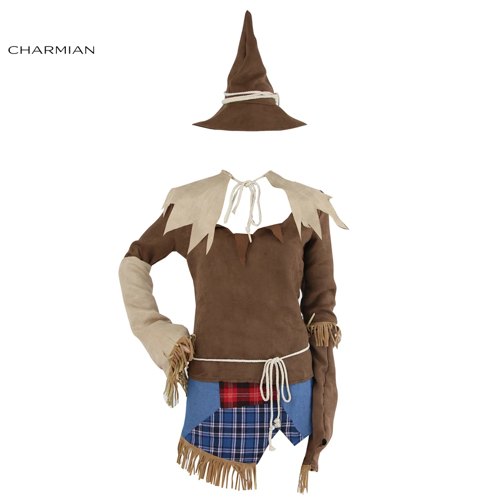 Костюм для взрослых «жуткое Чучело» включает в себя: классическую тунику, подходящий топ с асимметричной короткой юбкой, которая является дизайном в деревенском стиле чучело с клетчатым узоромЗаплатка, зазубренный подол, зубчатый воротник, сломанная и старая шляпа с патч акцентами, и параРукавицы с пугающими кисточками (веревки, коса, чулки и сапоги не включены).