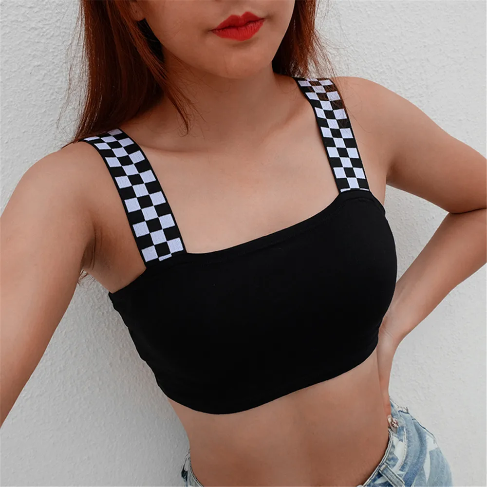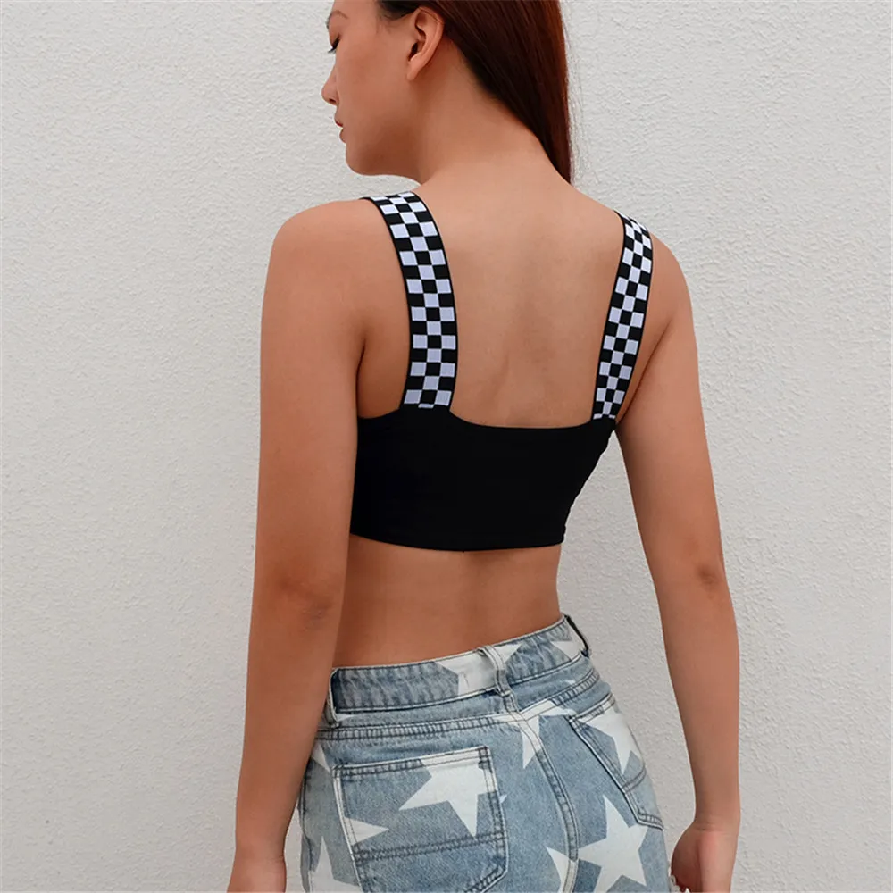 2018 женский модный сексуальный Клетчатый Ремень без рукавов, черный хлопок, топы пэчворк Тонкий Feminino Checkboard Camp Crop Топы