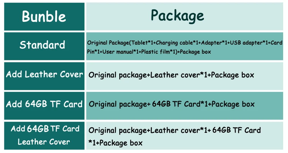 Примечание:Когда вы выберете вариант карты Tab + GB при покупке, мы вышлем вам64 ГБ TF картаТеперь вместо tf-карты на 32 ГБ для лучшего шопинга. Спасибо! :)