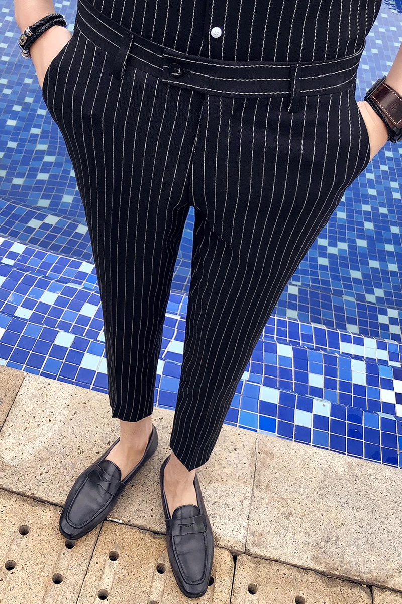 2018 Летние Мужские модельные брюки в полоску, черные, белые мужские брюки, модные мужские облегающие брюки, офисные брюки длиной до щиколотки