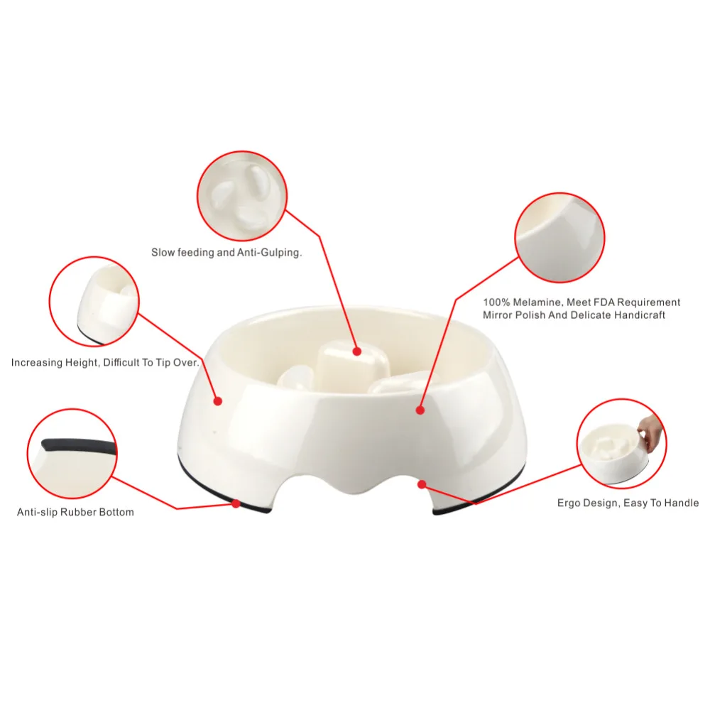 Чаша изготовлена из 100% пищевого меламина, который безопасен, безопасен для здоровья. Он отвечает всем стандартам безопасности пищевых продуктов, таким как FDA, LFGB. Конструкция с защитой от проглатывания может замедлить потребление пищи или воды для домашних животных, чтобы предотвратить расстройство желудка, рвоту и вздутие живота. Это отличное решение для вашего мехового малыша, который слишком быстро ест и пьет.
