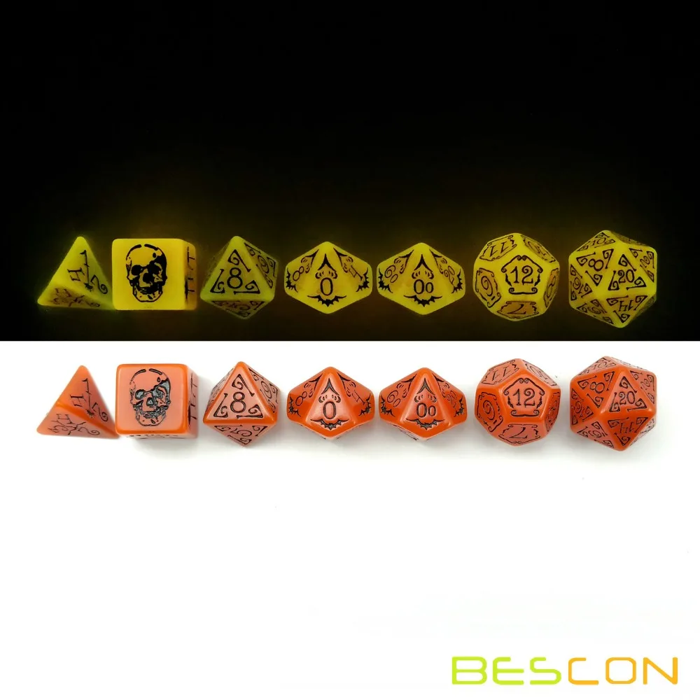 Bescon светящиеся Хэллоуин многогранные кубики, кисточки, набор из 7 шт, светящиеся Хэллоуин набор костей для ролевых игр, светятся в темноте Хэллоуин игра DND кости d4 d6 d8 d10 d12 d20 d % с кулиской мешок для ролевых игр