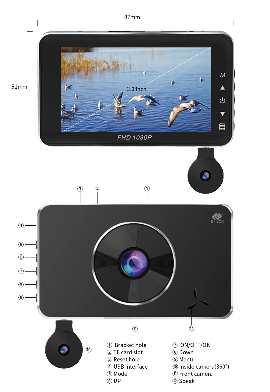 | Разрешение видео | Спереди: 1920*1080P @ 30 кадров в секунду; Внутри: 720*480P @ 30 кадров в секунду | |