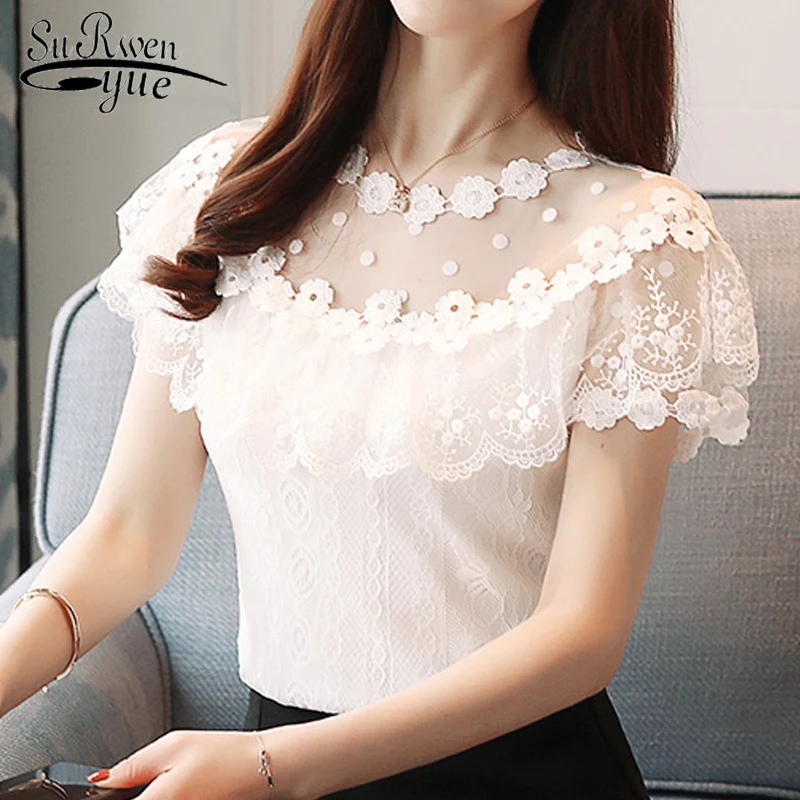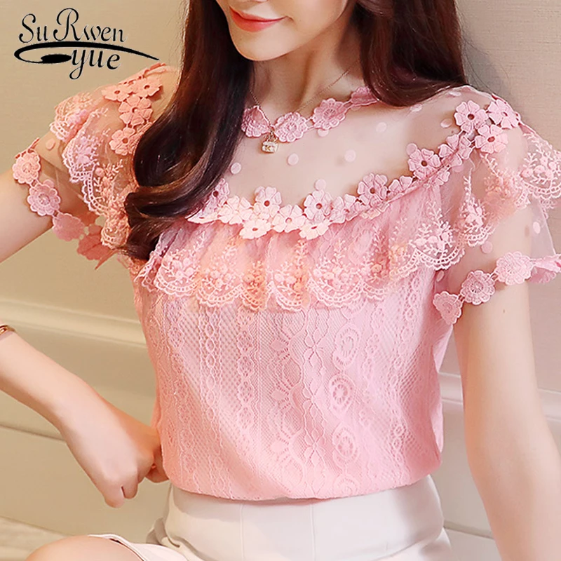 мода Новая 2019 женские блузки сексуальное кружево Женская одежда короткий рукав