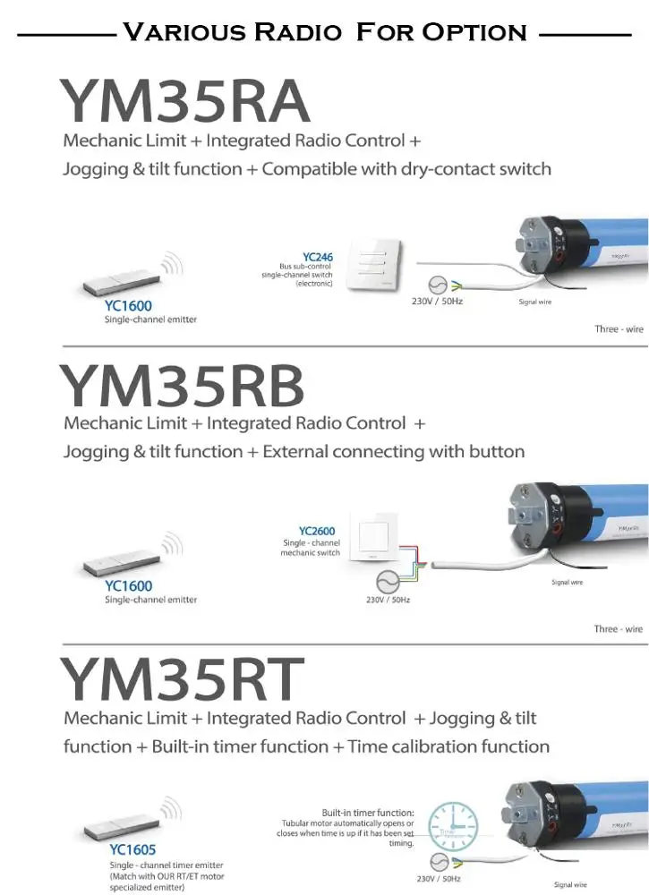 Это трубчатый двигатель 35 мм, который включает внутренний приемник и может управляться беспроводным излучателем. Механическое ограничение, интегрированное Радиоуправление, функция бега и наклона. Трубчатый двигатель YM35R подходит для всех видов рулонных жалюзи, входное напряжение от 120 В/60 Гц до 230 В/50 Гц