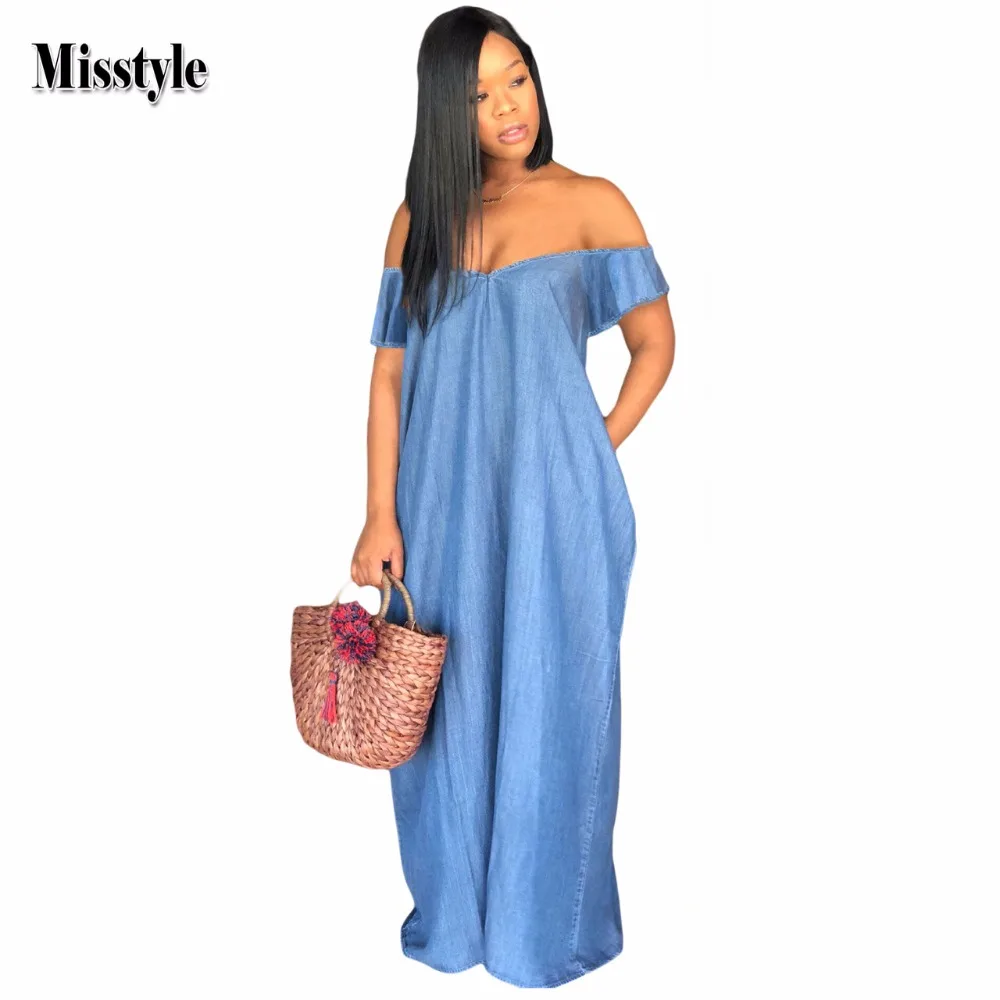 Название:Misstyle, джинсовое свободное макси платье, повседневное, женское, одноцветное, с v-образным вырезом, с вырезом лодочкой, длинное платье, летнее, с открытыми плечами, джинсовое платье