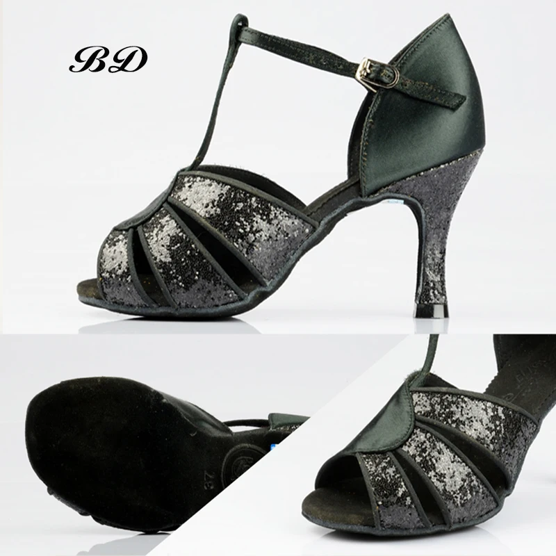 Профессиональная танцевальная обувь для бальных танцев; Женская обувь для латинских танцев; Женские сандалии для девочек; BD 236; Аутентичные Нескользящие стельки с блестками; Цвет черный, серебристый