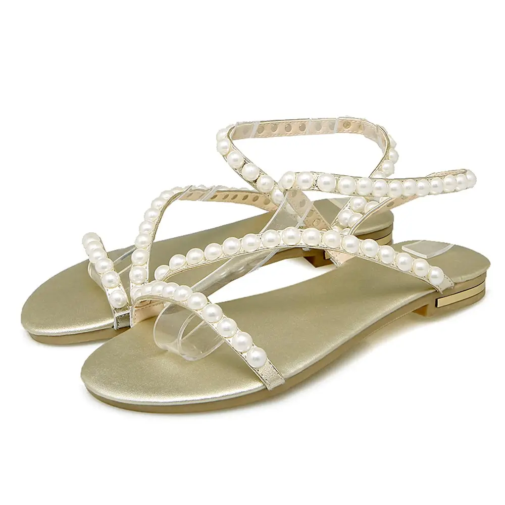 Lsewilly/летние женские босоножки из коровьей кожи на плоской подошве; Повседневные пляжные туфли с открытым носком и искусственным жемчугом; Цвет белый, золотой; Размеры 43; S285