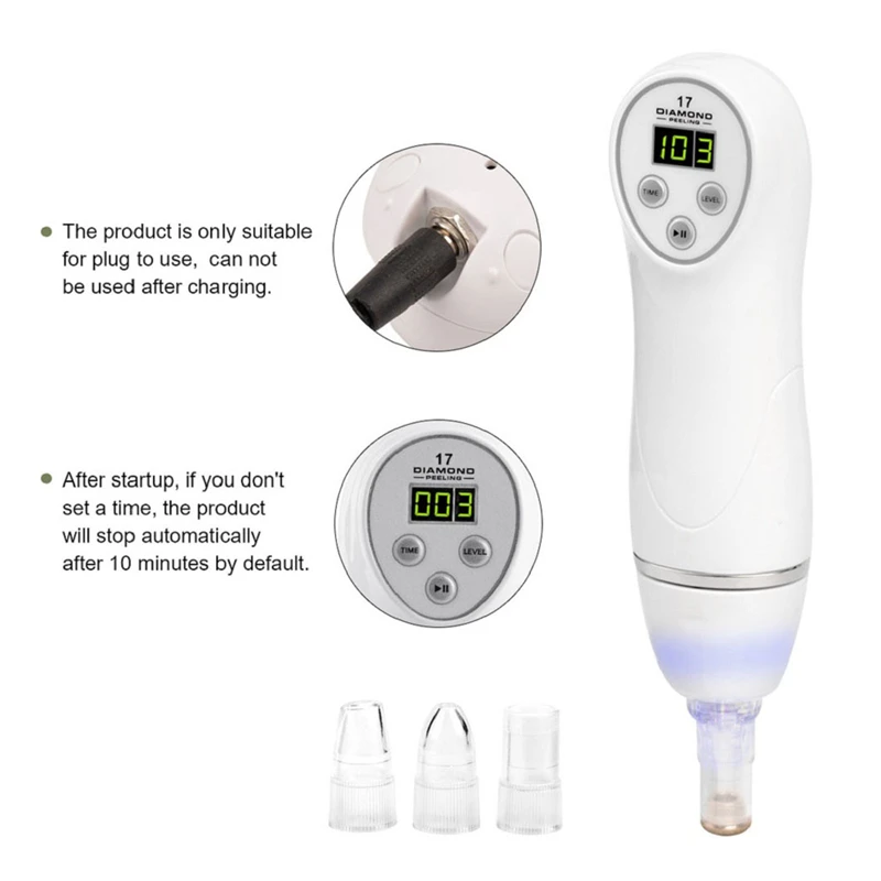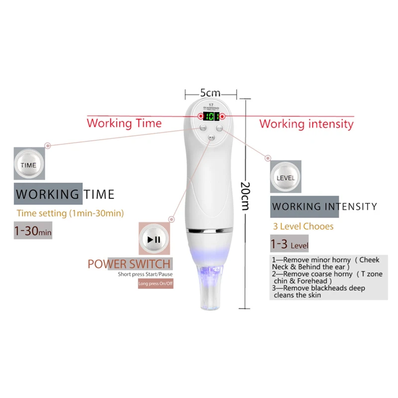 3 различной степени толщины головки для дермабразии и 3 головки для вакуумной обработки различных размеров. Алмазная головка: она может отшелушивать омертвевшую кожу и высасывать ее, чтобы восстановить кожу и удалить морщинки и акне. Большое круглое отверстие: мощные всасывающие угри, применяются против черных точек на носу и v-образной поверхности. (Используется с экстрактом черных точек и сжимающей пор водой) Маленькое круглое отверстие: всасывание слабое, его можно использовать для сосания черных точек, подходит для более тонкой кожи. Овальное отверстие: удаление морщин. После сосания кожи быстро отсоедините, а затем снова отсосите. Способствует циркуляции крови, повышает эластичность кожи, эффективно устраняет морщинки. Двойное фильтрующее устройство, легко чистится, эффективно предотвращает засорение внутри машины. Удаление старения кожи, Глубокая очистка пор. Уменьшает пигментацию кожи и неровный тон кожи. Встроенный волны 470нм синий светодиодный свет, стерилизовать и дезинфицировать, чистый и санитарный. Спецификация: Материал: АБС-пластик Напряжение: 100-240 В Частота: 50-60 Гц Мощность: 16 Вт Цвет: белый Вес: 330 г Размер: 20x5x3 см (длина * ширина * толщина) Подготовительная работа: 1. Полностью очистите лицо. 2. Горячее полотенце для лица в пор вашей кожи уменьшит давление при использовании этого устройства. 3. Он будет иметь лучший результат для работы с черной жидкостью. Как его использовать? (Лицевая сторона) 1. Вымойте лицо, высушите воду чистым полотенцем или салфетками для лица. 2. Нажмите кнопку ВКЛ/ВЫКЛ, чтобы включить устройство, установите скорость (1-3 уровня). 3. Управляйте им рядом с кожей. 4. Промойте кожу теплой водой (Не используйте очищающее средство для лица), усадку пор и увлажнение лица. 5. Очистите Ваш Алмазный аппарат для очистки кожи. Примечание: Не оставайтесь в одном месте более 3 секунд (конкретное время зависит от здоровья кожи и толщины кожи), или кожа может выглядеть покрасненной или даже фиолетовой, В этой ситуации необходимо немедленно прекратить холодный компресс, если состояние тяжелое, следует обратиться к врачу. Посылка: (упаковка в пузырчатую сумку, без коробки) 1 x дермабразия машина 1 x источник питания 1 пакет х хлопковый фильтр 1 пакет x губка фильтра 1 х сумка 3 x дермабразия головы 3 х всасывающая черная головка 2 x компоненты фильтра Руководство пользователя (на английском языке)-1 шт.