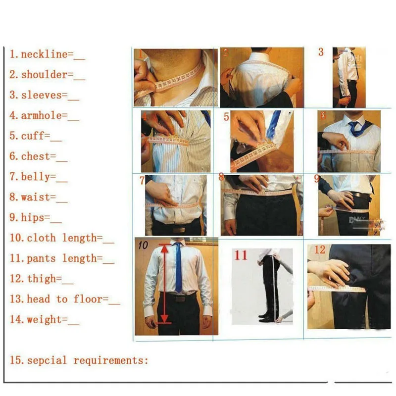 Примечание:Уважаемый покупатель, если вы обнаружите, что вышеуказанные стандартные размеры вам не подходят, вы просто измеряете свое тело в соответствии со следующим измерительным руководством, а затем покажете нам размер тела. Мы можем изготовить на заказ костюмы для вас. И цена такая же!