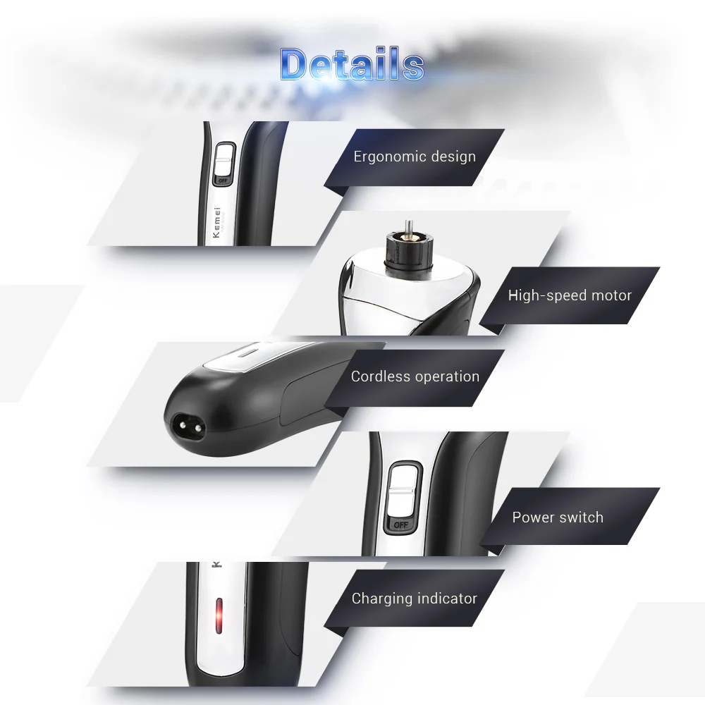 Название брендаKemeiНомер моделиKM-6550РазмерNose Beard Hair TrimmerМатериалABSТип товараHair TrimmerСертификация качества товара3CСертификация качества товараЕвропейский сертификат соответствияЕдиница измерения100000015Метод продажsell_by_pieceКоличество1Вес в упаковке0.348Размер в упаковке, Длина, см17Размер в упаковке, Ширина, см6Размер в упаковке, Высота, см22Global voltage100 - 240VRated frequency50Hz/60HzCharging time8 hoursRated power3WUsing time (razor 50 min 60 min barber, nose hair trimmer 90 min