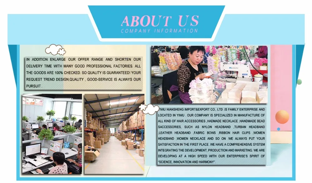 Наша компания поставляет различные виды аксессуаров для повязки на голову. Наши продукты очень хорошие и модные, они хорошо продаются на рынке США, на европейском рынке, на австралийском рынке. У нас есть собственная фабрика и комната для образцов. Мы доставляем товары очень быстро. Мы можем изготовить их в соответствии с вашим дизайном или отправить нам ваше произведение искусства.