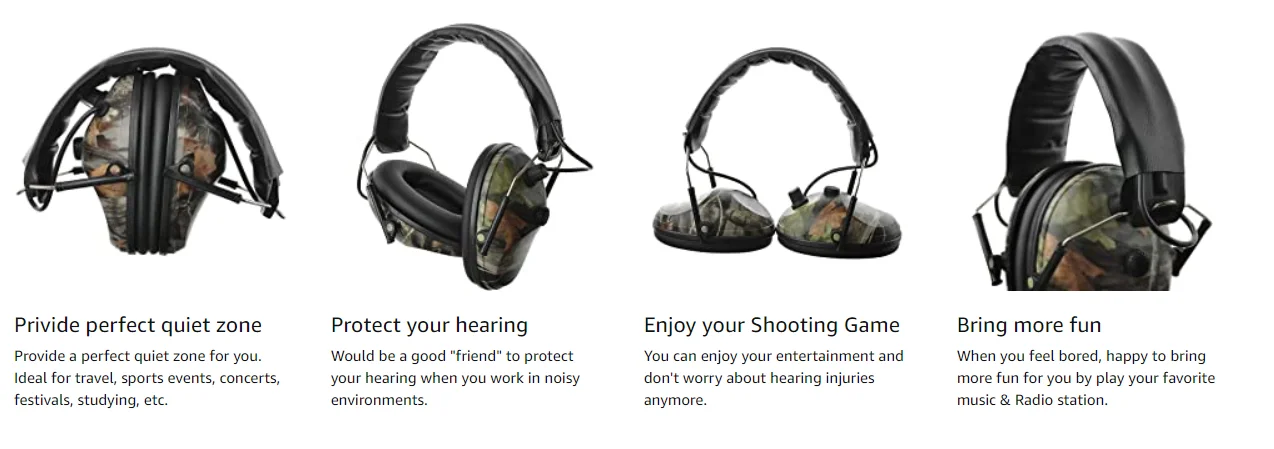 ● Блокировка опасных звуков-усиление отключается при 82 дБ. ● Удобное управление громкостью-поднятые гребни позволяют использовать тактильные даже при ношении перчаток. ● Компактное хранение-удобный складной дизайн для удобного хранения на расстоянии или в поле. ● Настраиваемая подгонка и комфортная ПОДБИТАЯ, телескопическая повязка регулируется для удобной, нескользящей посадки. ● Полное оповещение о ситуации-направленный стерео-микрофон усиливает команды диапазона и экологические звуки до безопасного 82 дБ. ● Один ветростойкий и высокочастотный микрофон позволяет отключить челку и улучшает разговор. ● Энергосбережение-Работает на 1 батарее AAA. (Не входит в комплект)