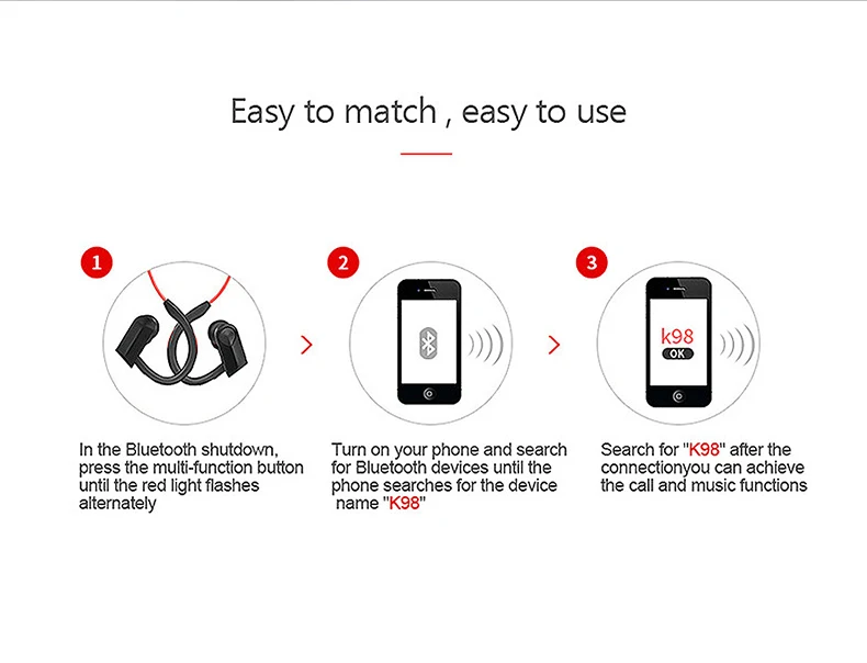 1: новейшая технология Bluetooth V4.1 2: международный бренд CSR чип 3: батареи большой емкости используются в течение длительного времени 5: Предназначен для занятий спортом; Однотонная одежда 6: сабвуфер стерео звук 7: микрофон высокой четкости поддерживает звонки 8:K98 Модные Bluetooth спортивные наушники 9: Модные Bluetooth спортивные наушники